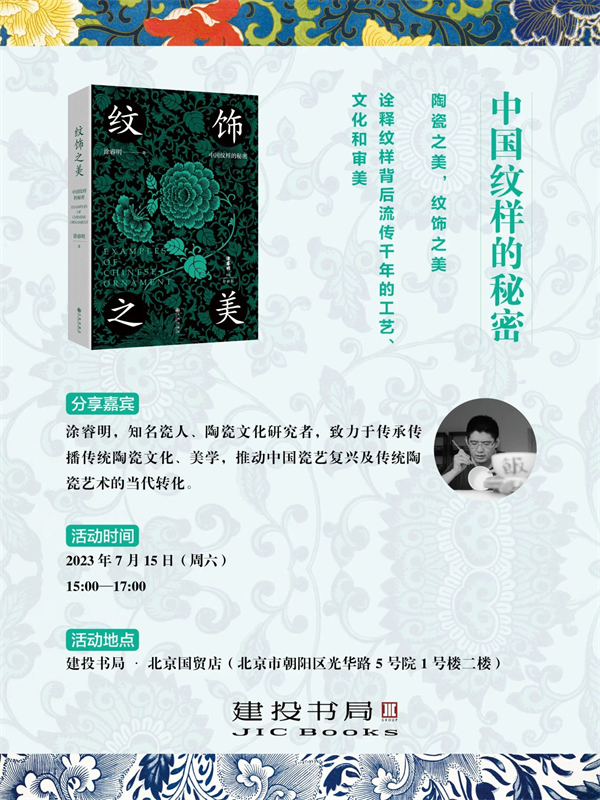通过《纹饰之美》这本小书,我们得以借助欧文·琼斯这位西方著名设计师的眼与笔,重新审视我们自己的文化与美学,让我们从纹样这个局部以管窥豹,去更深入地了解和欣赏古代中国文化的丰富与美。7月15日下午,建投书局联合九州出版社邀请到资深瓷人、作家涂睿明,通过欧文·琼斯笔下的中国传统纹饰,一同领会中国传统纹饰中隐藏的秘密与传奇。