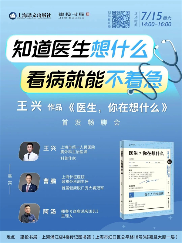 《医生,你在想什么》是医生、科普作家王兴继《病人家属,请来一下》之后最新出版的医疗科普书。结合一线执医多年的经验,王兴从寻医、问诊、治疗各个环节中可能碰到的相关问题出发,用通俗易懂的语言讲述了医生面对这些问题时会怎么想、怎么做,为大家提供一堂“每个人的疾病课”。7月15日,王兴和上海长征医院颈椎外科副主任曹鹏、播客《这病说来话长》主理人阿汤将一起做客建投书局,跟大家一起聊聊“医生在想什么”。