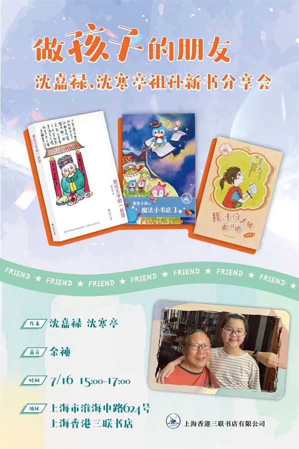 暑假是孩子们的心灵加油站,上海书店出版社、上海香港三联书店特意在暑假期间举办沈嘉禄与孙女(黄浦区蓬莱路第二小学四年级沈寒亭同学)的新书发布会,一本是《致灶王爷的一封信》,一本是《蓬莱小镇之魔法小书店丛书第三套》中的《我与十位大师面对面》。活动也将邀请蓬莱路第二小学校长、党支部书记、全国未成年人思想道德建设工作先进工作者余祯女士来到现场,与沈嘉禄和沈寒亭一起对谈:如何通过阅读与写作来培养孩子的兴趣,提升孩子的素质,做好孩子的朋友。