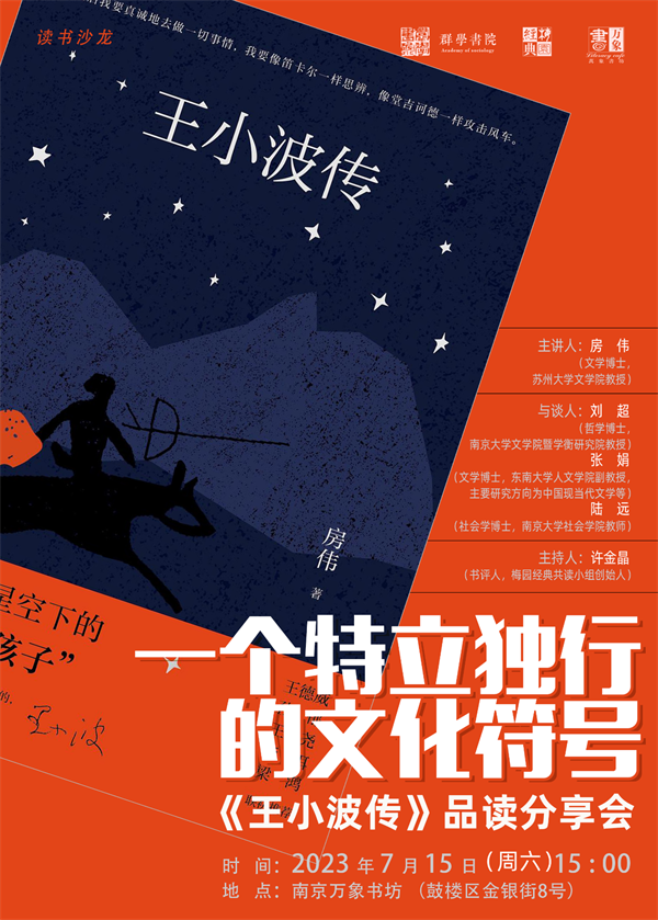 为了更好地认识和了解王小波,7月15日,群学书院联袂梅园经典共读小组将在南京万象书坊以线下读书沙龙的形式共读《王小波传》一书,一起交流小波带给读者的感动以及生活启示。本次读书会邀请《王小波传》的作者房伟老师,与师友们一起回望王小波短暂而又绚烂的一生;同时,三位与谈人——刘超老师、陆远老师和张娟老师将分别从王小波的留美经历对其创作影响、许倬云老师对王小波的指导及其后续职业发展的影响、王小波与李银河的爱情生活及对其文学特质的影响等方面同各位师友展开交流与讨论。