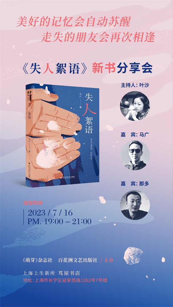 马广是知名青年文学刊物《萌芽》的资深作者,2021年7月《失人絮语》在《萌芽》上开启连载。2023年4月《失人絮语》单行本由百花洲文艺出版社出版上市。7月16日晚,我们在上生新所茑屋书店举办《失人絮语》新书分享会,邀请到作者马广,与知名主持人叶沙、悬疑小说家那多,共同聊聊他们关于《失人絮语》的创作和阅读体验。