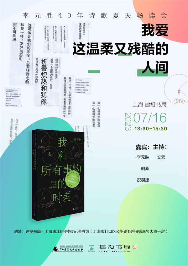 《我和所有事物的时差》为诗人李元胜40年诗歌精选集。近年来,李元胜的代表作《我想和你虚度时光》等传诵度极高,使之成为引人注目的大众诗人。本书精选了他40年来创作的200余首诗歌,作为他诗人生涯的一个总结。周日下午,我们邀请李元胜,以及诗人、学者胡桑,作家祝羽捷做客建投书局,一起畅读李元胜的诗。