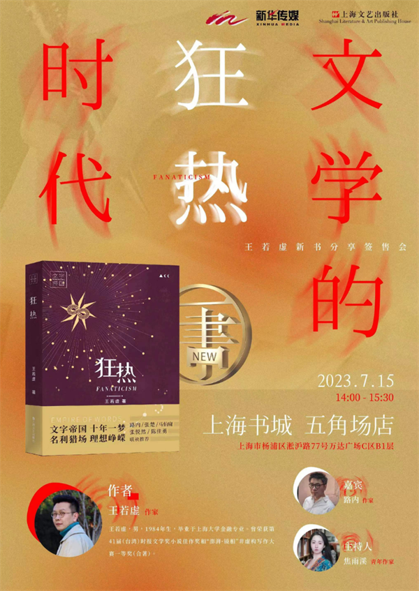 青春与梦幻、野心与天真、上升与坠落,王若虚几易其稿,诚意打造新书《狂热》。当年那些让我们狂热的作者去哪了?他们都还好吗?7月15日,作家王若虚将做客上海书城五角场店,举办以“文学的狂热时代”为主题的新书分享会,与读者们分享《狂热》一书背后的创作故事。
