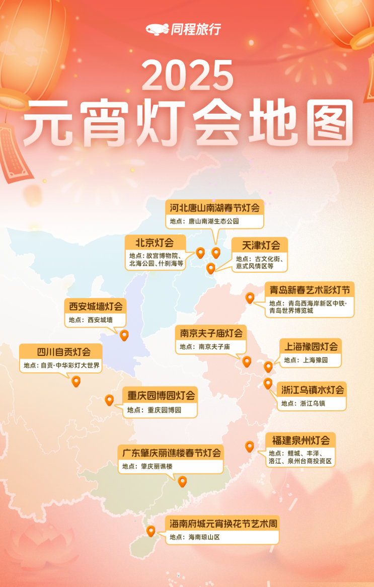 2025年元宵节将至,以非遗灯会为核心的传统文化盛宴在全国各地精彩上演。2月10日,同程旅行发布《2025年元宵节非遗灯会赏灯地图》,从北国冰城到南国花城,从西部古城到东部海滨,非遗花灯以其独特的文化魅力点亮各地元宵夜。同程旅行数据显示,今年元宵灯会热门TOP10城市分别是:沈阳排名第一,其次是南宁和镇江,成都、广州、开封、苏州、上海、南京和杭州紧随其后。