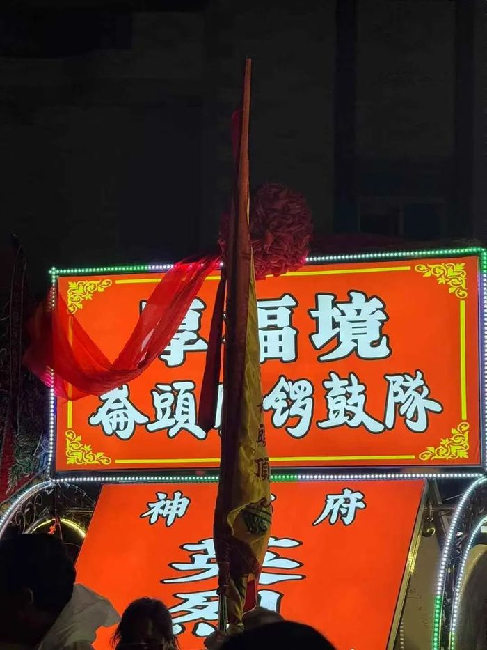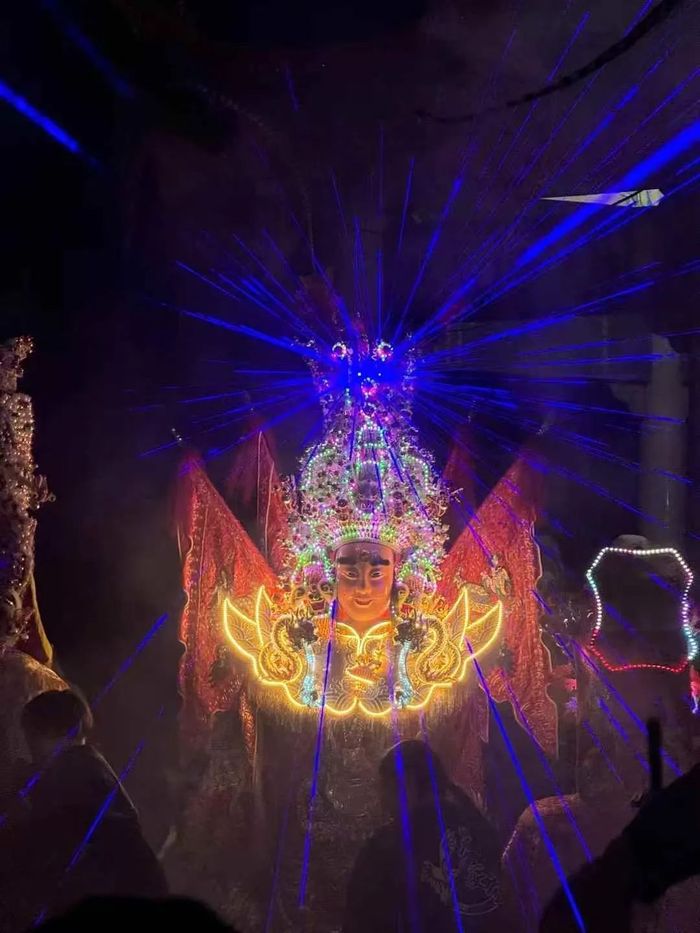 几年前还只用红绸灯笼照明的游神队伍,如今被改装成移动光影秀,神将塔骨肩部以上缠着霓虹灯带,头饰中心的镭射灯发出夺目的蓝、绿光带,白色泡泡、亮片彩带漂浮周围。