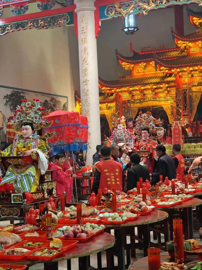 橙子家请的神将塔骨平时在庙里,只有订下了巡境的日子,才会在前一天把神将请出来。筹备从年前开始,筹集款项基本每家都会出几百块到几万元,神将分为三种,公家塑造,村民自请,以及从别的村子请来的。巡境当天中午摆上酒席,捐款的村民都会来吃席,吃完饭收拾完,撤掉椅子,留下桌子,村民们就接着上供品。六点游神前下午还会有一次踩街,提前把路线走个大概,村里的人早早吃过晚饭就等着六点正式开始游神。