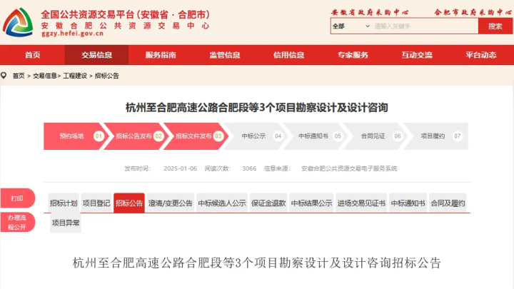 相关招标公告显示,杭州至合肥高速公路合肥段分为两段,分别是G0323济宁至合肥高速公路杨店枢纽至石塘西枢纽段、杭州至合肥高速公路石塘西枢纽至马鞍山市界段。