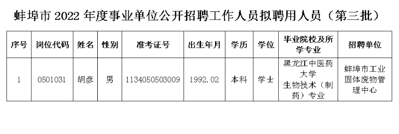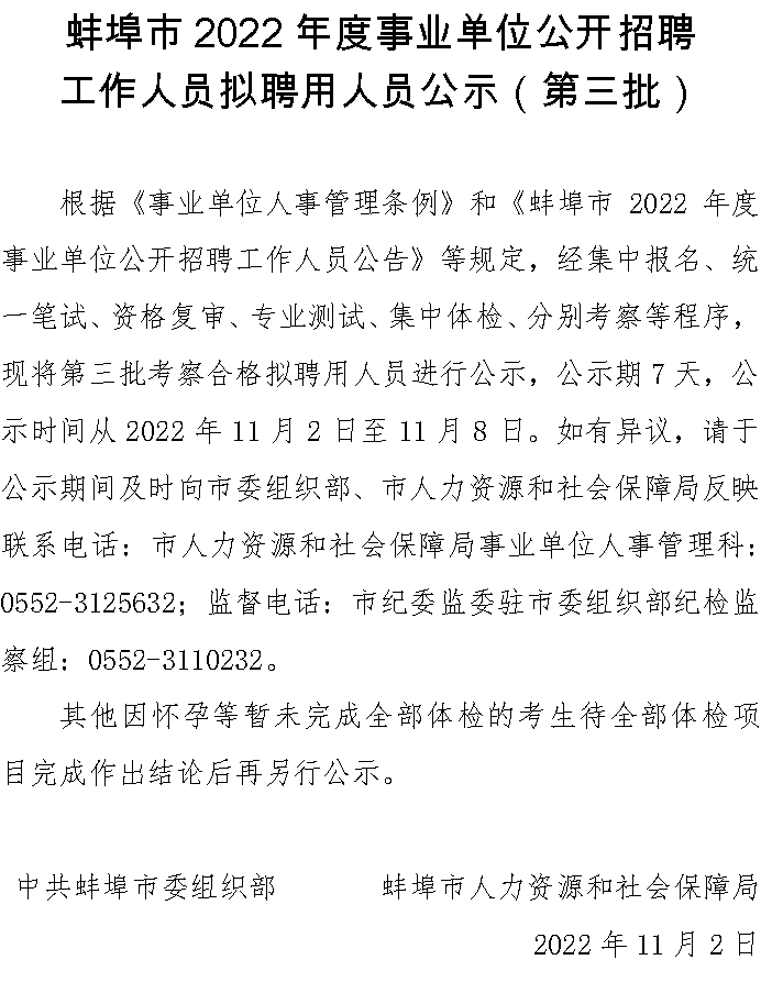 蚌埠市2022年度事业单位公开招聘工作人员拟聘用人员公示(第三批)