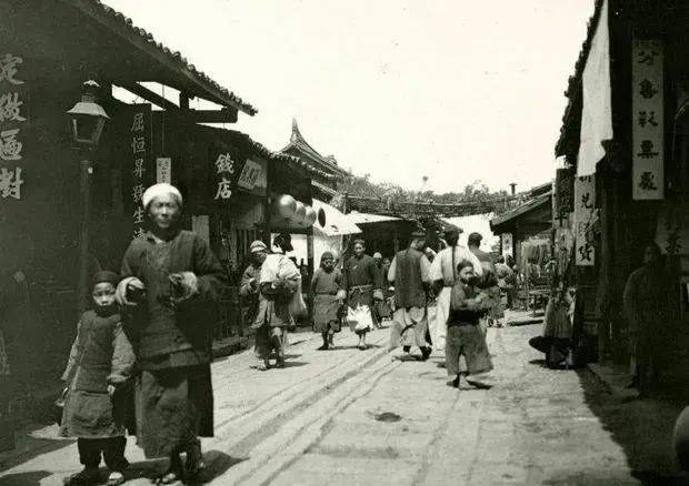 各个店铺有着一丈余长、二尺多宽、五六寸厚的黑漆或朱漆招牌,其上嵌着金箔、刻着对联,金光灿烂,远远望去,连成一片。