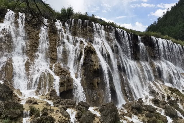 树正瀑布在树正群海的上游人如织的树正寨前公路旁,是入沟见到的第一个瀑布,也是九寨沟四大瀑布中最小的一个。虽然最小,但也能让初游九寨沟的人惊心动魄。树正瀑布海拔2295米,高25米,瀑顶宽72米,是无名海水沿湖堤奔突,被水中树丛分成数以千计的水束汇集到树正瀑顶。瀑布飞落溪涧,雪峰银瀑,上游的湖水沿着浅滩四处漫流,被水中的树丛分成无数股水流,最后汇集到树正瀑布顶端的山崖边,奔流附落,水雾四散,绿树翠流,构成印象画般的背景,如诗如梦。