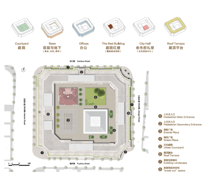 项目主要建筑包括沿街围合建筑、庭院红色建筑、庭院多功能建筑、地下空间等,地上建筑面积约4.2万平方米,围合建筑庭院内拥有约3000平方米公共开放市民空间,地下建筑面积约2.6万平方米,提供约300个停车位。