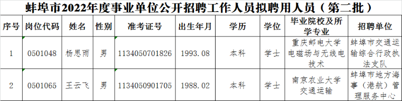 2022年蚌埠市事业单位招聘拟聘用人员公示(第二批)