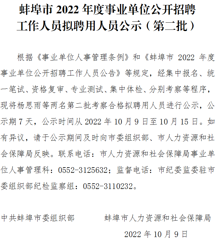 原文标题:蚌埠市2022年度事业单位公开招聘工作人员拟聘用人员公示(第二批)