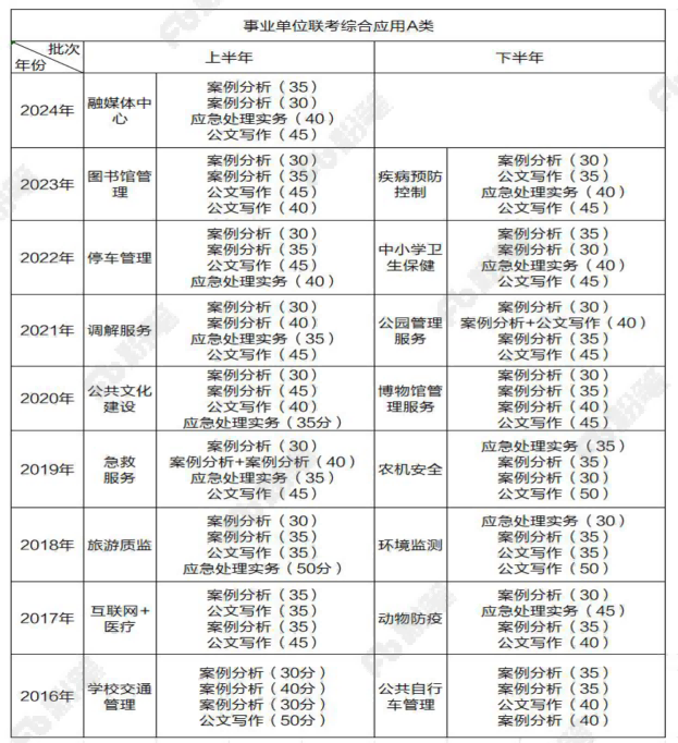 综合应用A类试卷由注意事项、背景材料和试题三部分组成,全部是主观性试题。考查的题型较为固定,从2016—2024年的真题来看,案例分析和公文写作、应急处理实务三种题型分天下。并且不断出现一些题型融合的情况,具体如下表: