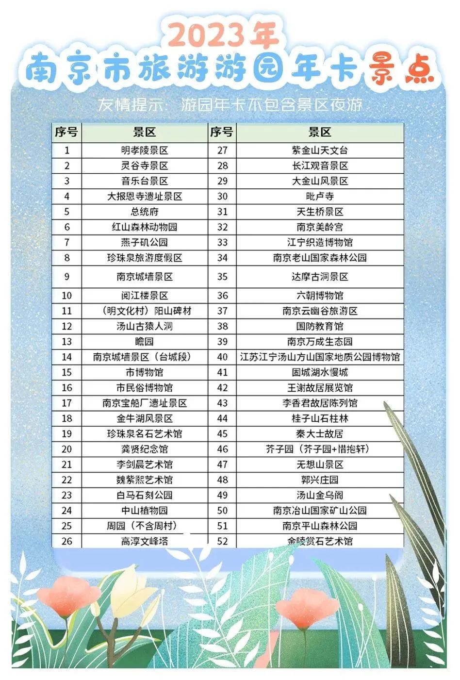 1月13日,2023年南京市旅游游园年卡正式发行。今年的游园年卡共包含明孝陵、灵谷寺、总统府、红山森林公园、金牛湖风景区等52个景点景区,与去年相比增加了5个景点,售价260元保持不变。年卡有效期为开通游园功能日起,为期一年,一年内52个景区(点)正常开园时间(不含夜游),不限次免门票游览。