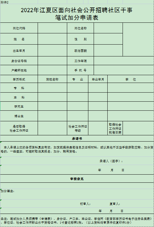 笔试加分资格认定。持有助理社会工作师、社会工作师、高级社会工作师职业水平资格证书的应聘人员可申请笔试加分,笔试成绩分别加2分、5分、8分(每名考生按最高等级证书予以加分,不重复加分);报名审核通过及缴费成功的应聘人员应主动向江夏区民政局提出加分申请,并提交审核所需资料,未按时参加资格认定的,视同放弃笔试加分资格。