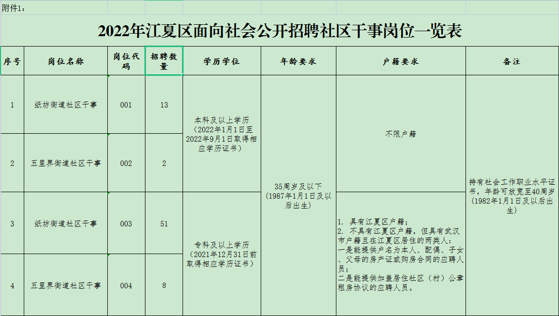 为适应新时代城市社区治理的需要,进一步加强社区工作者队伍建设,及时补充社区干事岗位空缺,根据《武汉市社区工作者管理办法》(武办发〔2020〕2号)、《江夏区委组织部 江夏区民政局 江夏区人社局关于进一步规范管理全区社区工作者选任招聘工作的通知》(夏民政〔2022〕1号)文件精神,现结合我区实际,面向社会公开招聘社区干事74人。具体公告如下: