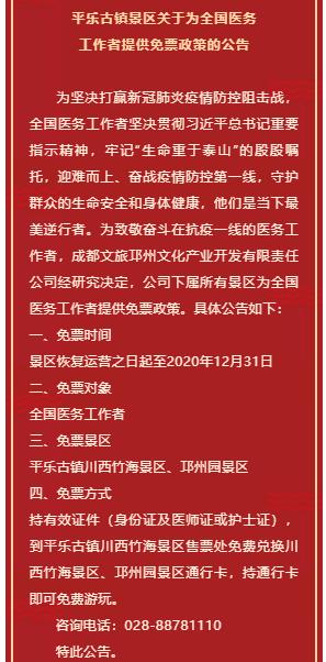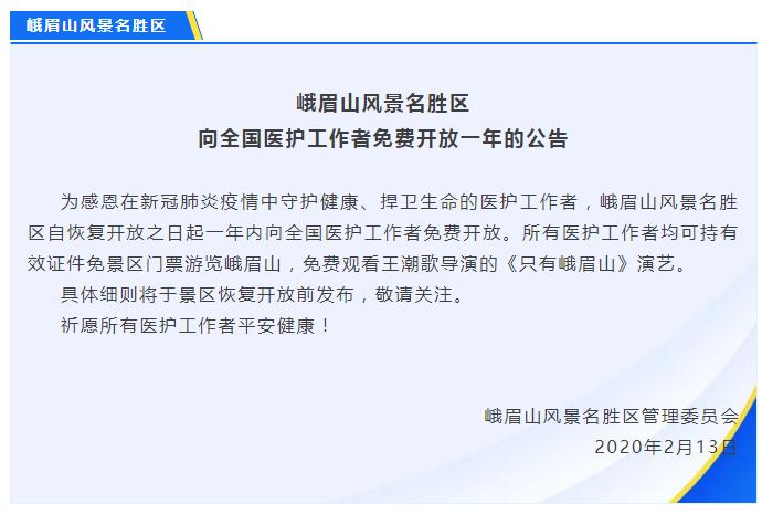 从四川省文化和旅游厅获悉,为致敬奋斗在抗疫一线的医务工作者,截至2月14日17:00时,全省已有百家文化和旅游景区向全国医务工作者发出了疫后免费游四川的“邀约”,邀请他们在景区恢复开放后,全年免门票游览。
