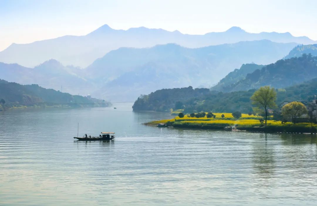 舟行碧波上,人在画中游。新安江山水画廊,是一条极具诗情画意的风景带,顺流而下,沿途村落遍布,粉墙黛瓦的古徽州建筑,宁静悠然的古村,在连绵起伏的青山和碧波荡漾的江水映衬下,勾勒出一幅绝美的山水画卷。新安江畔最美季节就是春季,大片的油菜花田在薄雾的笼罩中,若隐若现,处处风景如画。