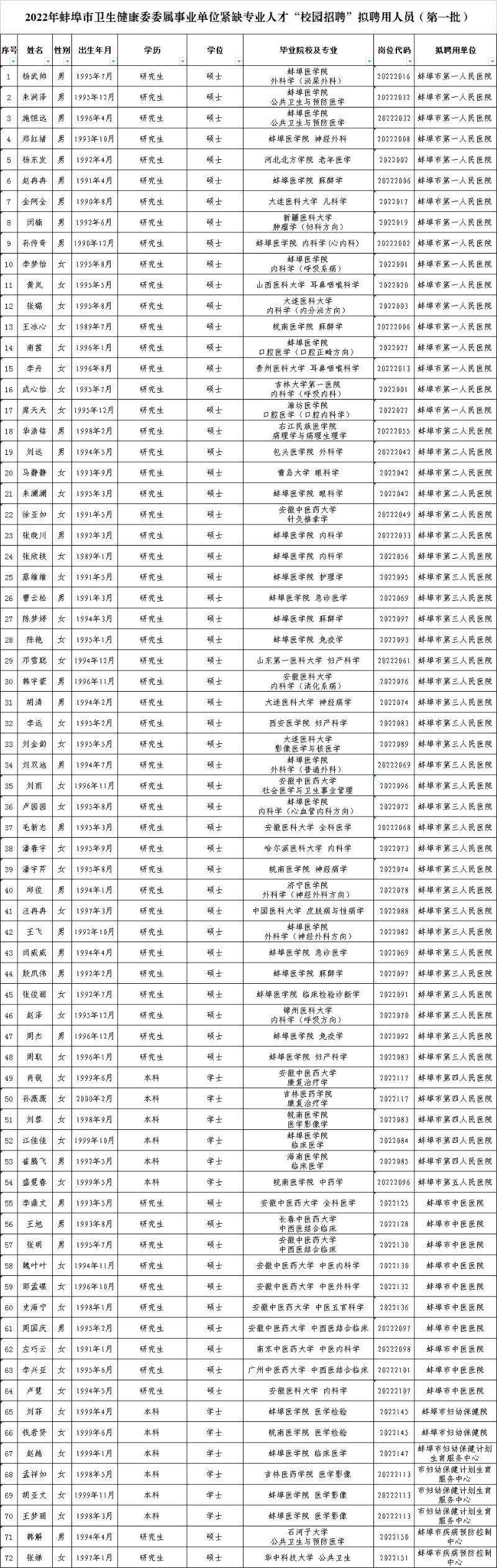 根据《事业单位人事管理条例》、《蚌埠市卫生健康委委属事业单位紧缺专业人才“校园招聘”公告》、《蚌埠市卫生健康委委属事业单位第二批紧缺专业人才“校园招聘”工作公告》等文件要求,经报名、资格审查、面试、体检与考察等程序,现将杨武帅等72名符合公开招聘条件人员进行公示,公示期7天, 2022年10月20日至10月26日。如有问题,请于公示期间及时向市卫生健康委、市人力资源和社会保障局反映。