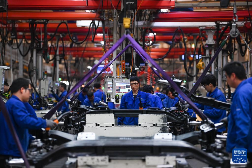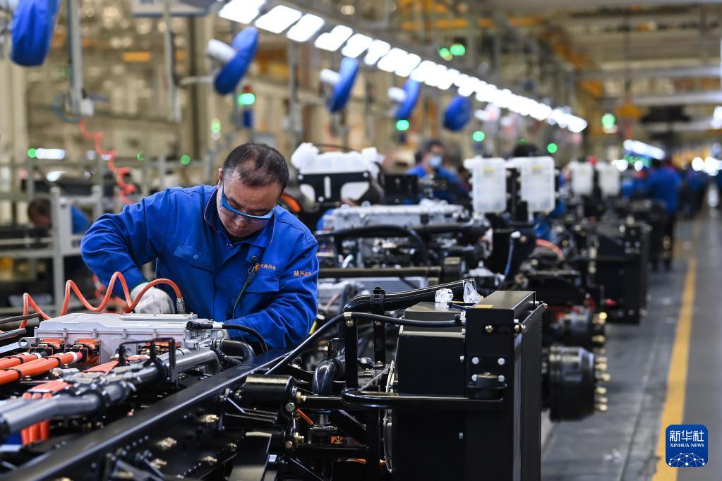 2月27日,工作人员在位于宝鸡市岐山县的陕汽集团商用车有限公司总装车间生产线上作业。