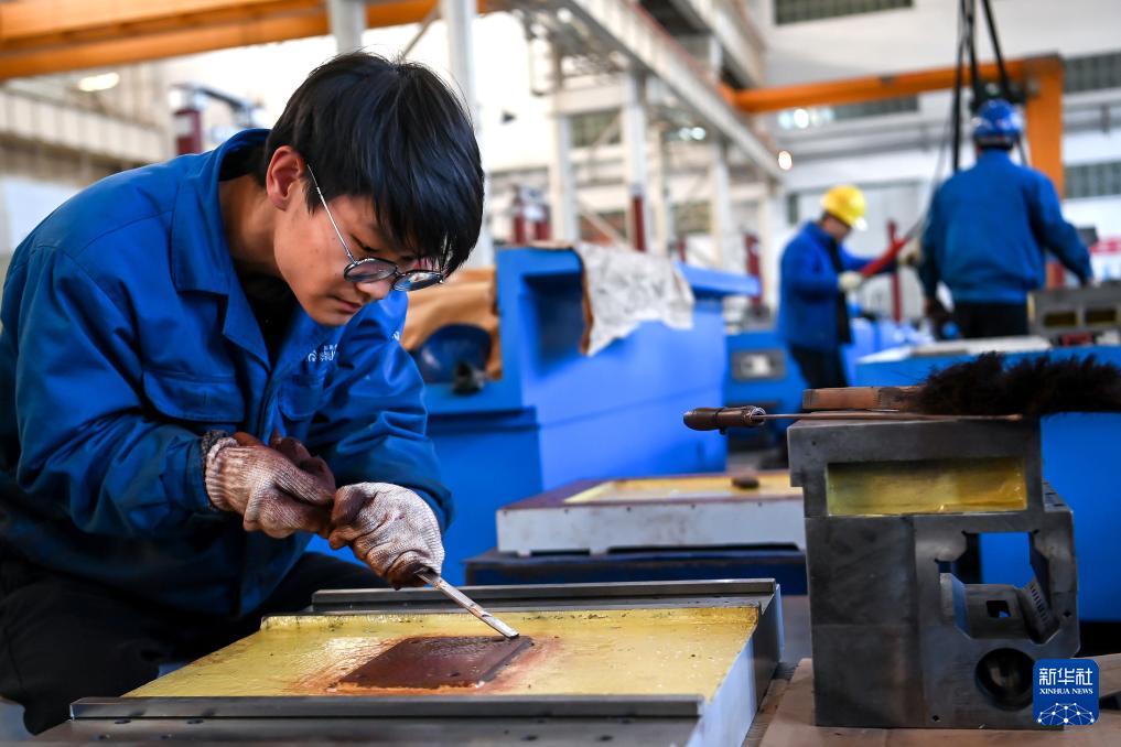 2月26日,工作人员在位于宝鸡市渭滨区的陕西秦川机床工具集团股份公司生产车间刮削零部件。
