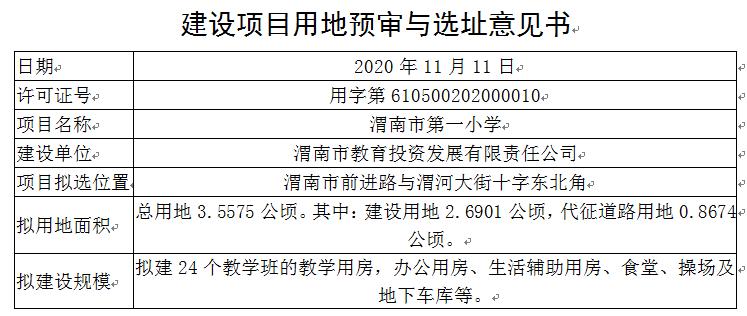 据了解,渭南市第一小学项目位于前进路与渭河大街什字东北角,东邻桃园小学,西邻前进路,南邻渭河大街,北邻区间路、宣化馨城保障房。项目总用地面积75.07亩,建设用地面积58.56亩,规划总建筑面积3.24万平方米,总投资2.38亿元。