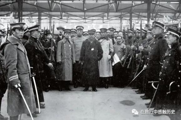 首先,孙中山就职时穿着是西装,还是中山装?其实根据孙中山在上海火车站的合影,这是他距就职典礼所拍摄的时间最近的一张照片。孙中山内穿军服,外罩深色大衣,头戴军帽。在孙中山胸前明显佩戴着两枚徽章。