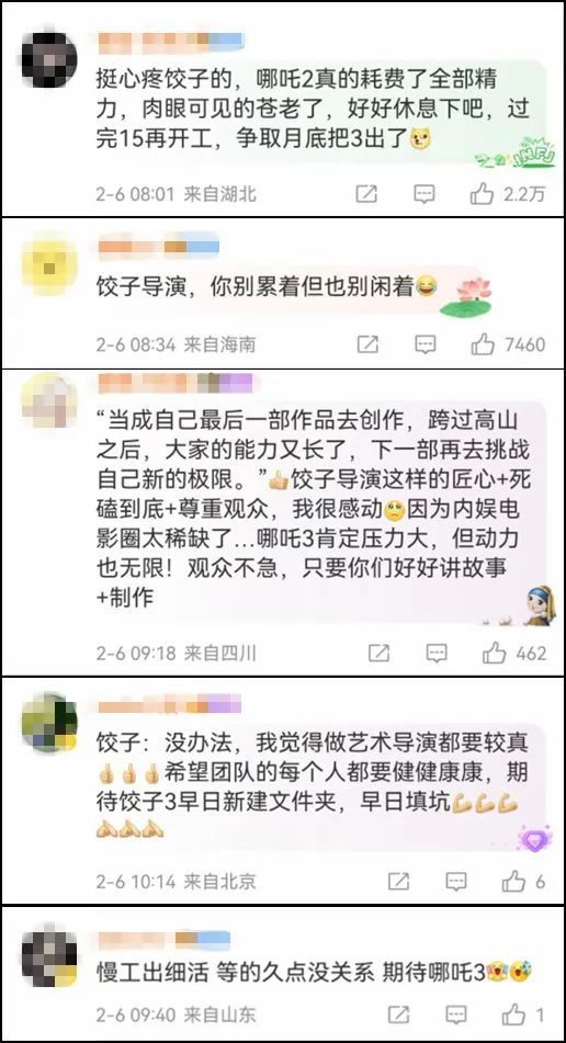 当然,评论区还有很多网友在搞怪催更:“好好休息下吧,过完十五再开工,争取月底把3出了!”“饺子导演,你别累着但也别闲着!”