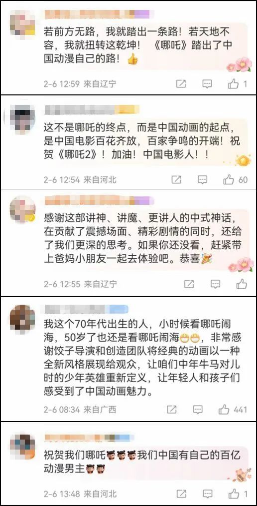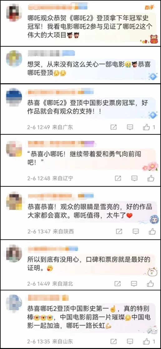 《哪吒2》登顶后,网友纷纷在评论区祝贺:“想哭,从来没有这么关心一部电影,恭喜哪吒登顶”“恭喜小哪吒!继续带着爱和勇气向前闯吧!”“哪吒值得,太牛了!”