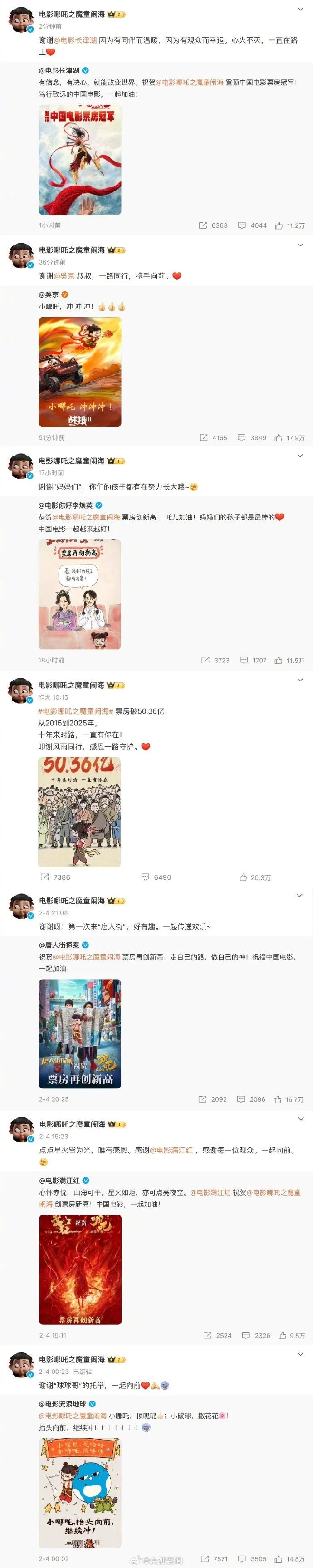 票房一路高歌猛进,《哪吒之魔童闹海》也收到了包括《长津湖》《战狼2》《你好,李焕英》《流浪地球》等“前辈”发来的创意“贺电”。