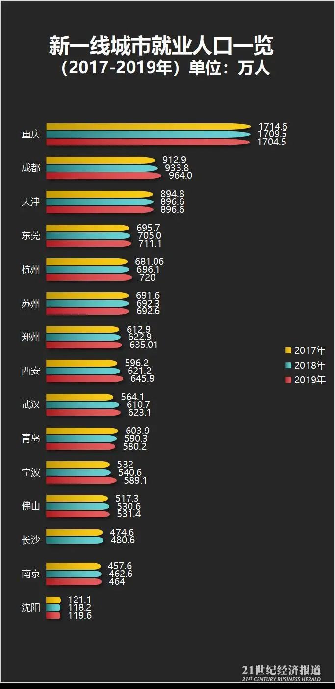 与之形成鲜明对比的是,部分新一线城市就业人口的快速上涨。2016年,西安的从业人口仅为539.18万人,这一数字在2017年上涨到596.21万人,并在2018年上涨到621.22万人,2019年上涨到645.86万人。