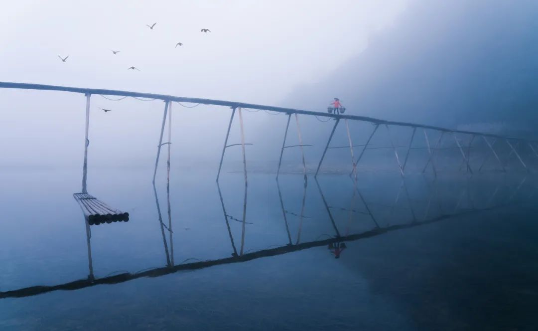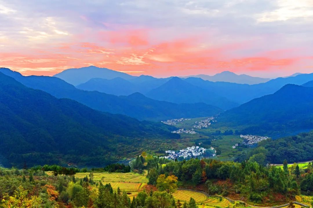 山下黛瓦白墙的古村落在袅袅炊烟中