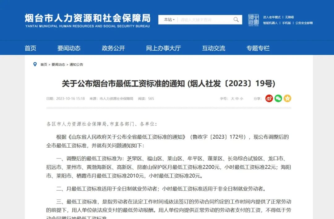 10月16日,市人社局公布调整后的烟台市最低工资标准。