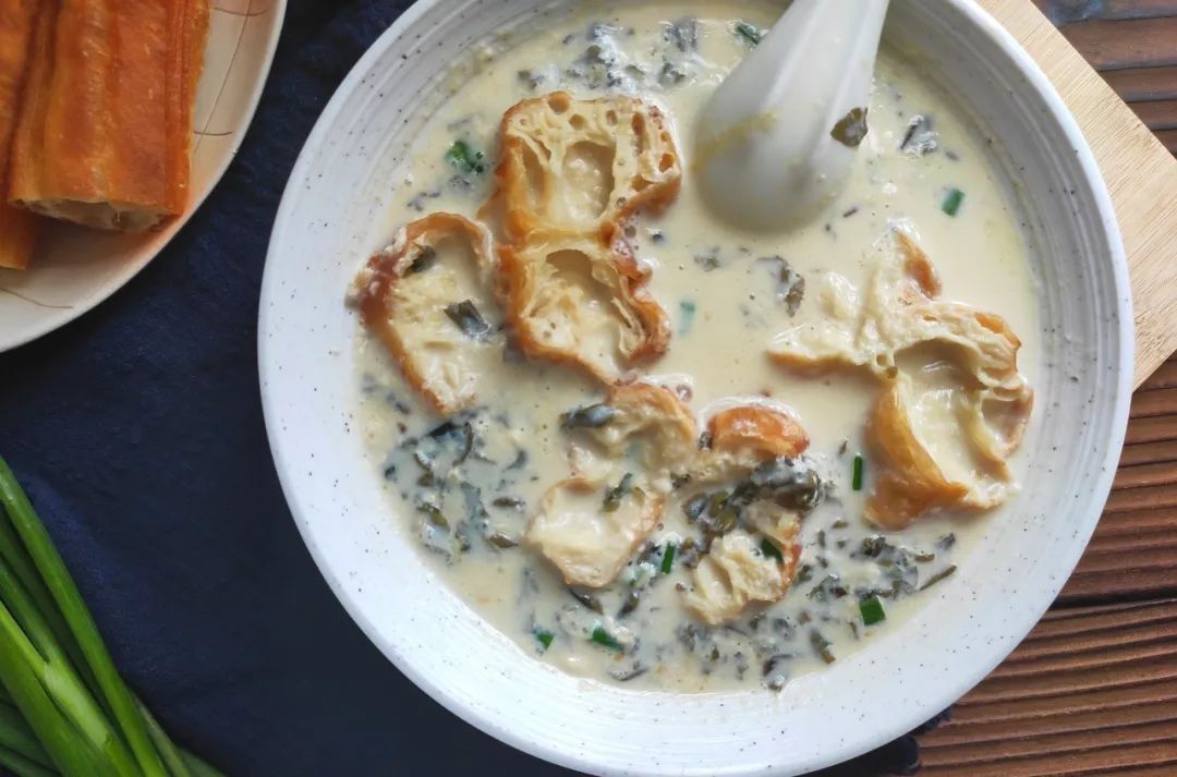 油条片、榨菜末、虾皮、葱花、紫菜,加一小匙兑了一点醋的鲜酱油,加上高冲而下的姿势,碗里的咸浆就会起花。