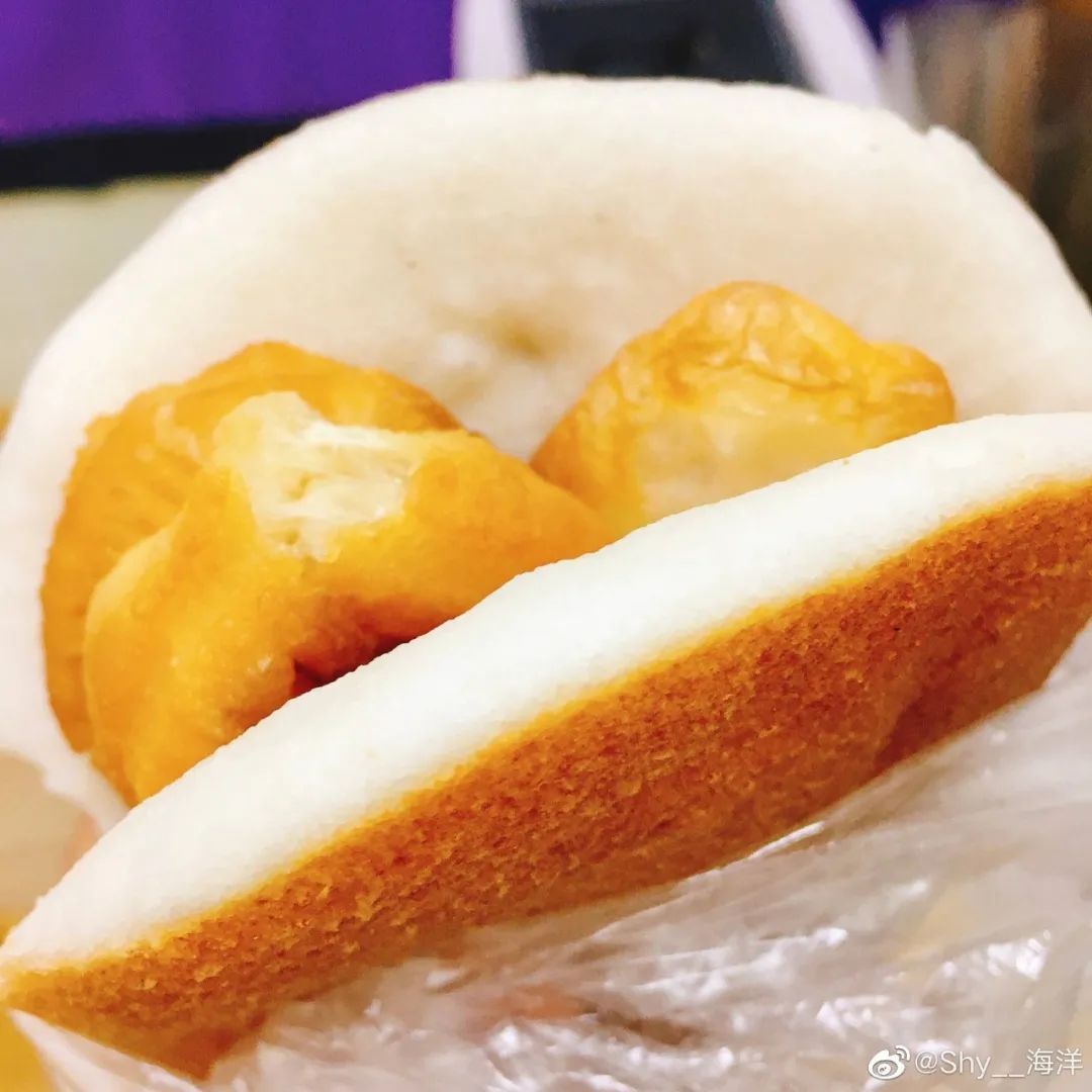 一根油条一折为二,放在大饼中央;再把大饼对叠,油条就成了馅。父辈们总说,以前如果早上吃上一副大饼油条,再加一碗豆浆,那一天舒服极了!