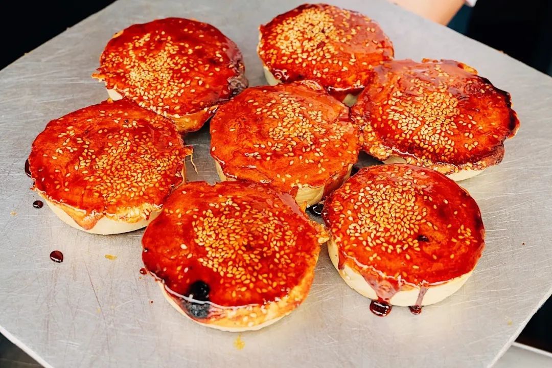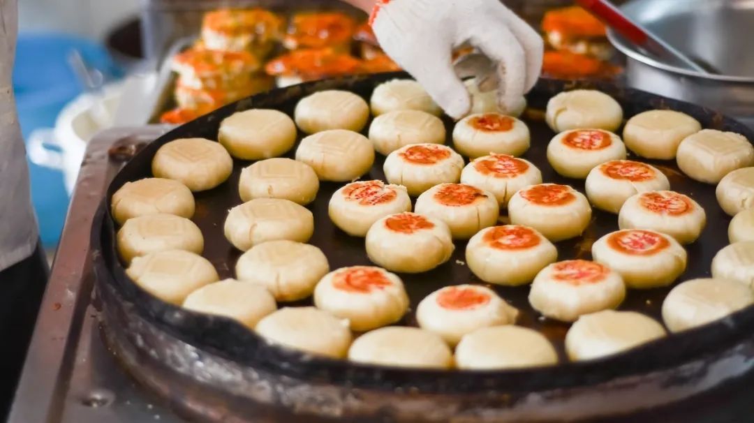 现做现卖的鲜肉月饼,朴实的酥皮里,包裹着新鲜猪肉,咬一口还有温热的汤汁溢出,美味无比!