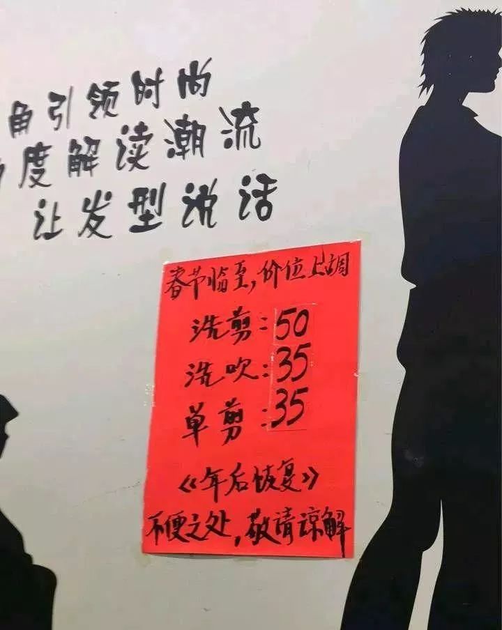 在春节,找最普通的总监老师剪个头发,花上一百稀疏平常。餐馆更不用说,普遍会加收10%—20%不等的服务费。有车一族,没有翻倍的价格,别想洗一次车。