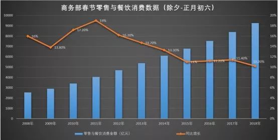 可以将它与GDP增速对比。2012年,春节零售餐饮销售额是4700亿元,2018年是9260亿,增长了近一倍,具体增幅为97%。