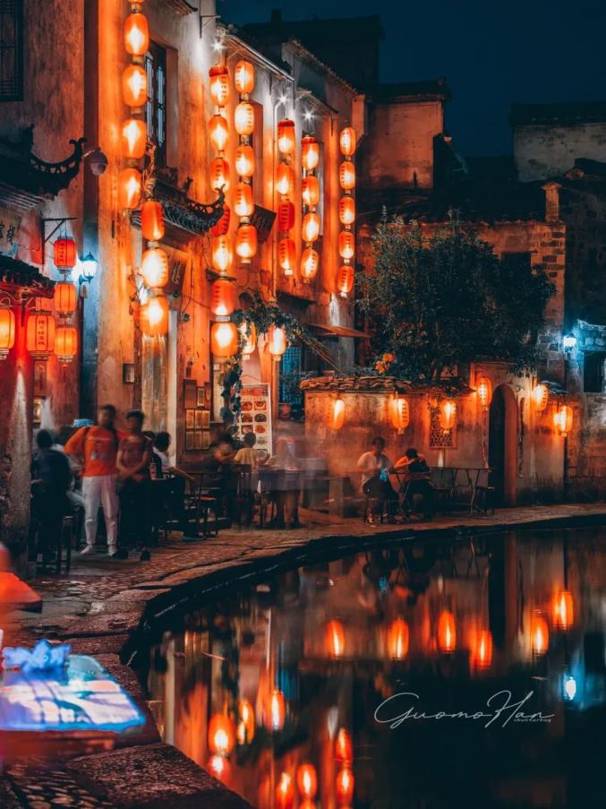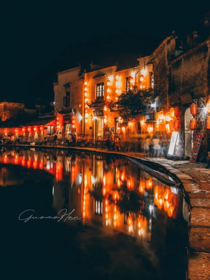 而夜晚的宏村,星河璀璨,月沼倒映月华星辰。一串串红灯笼亮起,美丽又宁静。