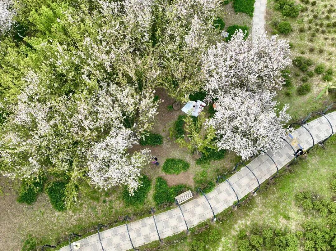 步入绣江河公园,海棠花如胭脂晕染,樱花似烂漫云霞。