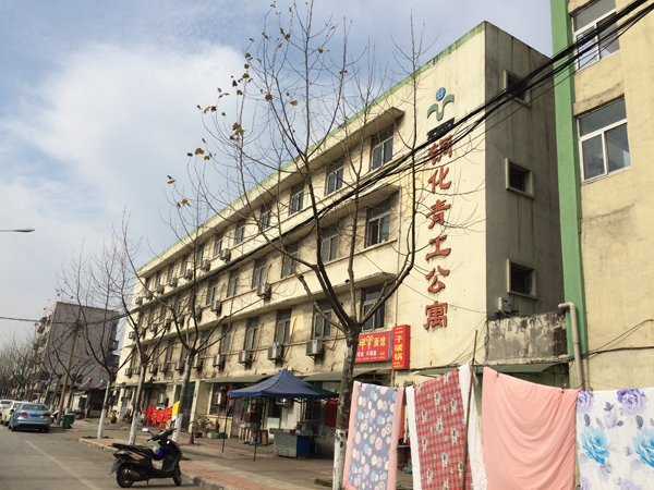 事实上,周边居民与老沈一样同为原重化工厂工人的不在少数。据铜官区滨江社区居委会工作人员钟承艳介绍,跃进东西村、跃进新村、红光、汇景新城、勤奋安置点等小区属于该社区范畴,16年9月不完全数据显示,社区居民人数在1万1千人左右,“大部分是原来或现在化工厂的工人”。走在金山西路周边,时常能看到身穿蓝色、橙色工作服的人们走动,也有人骑着电动车趁中午回家一趟再返回厂区,街道两旁遍布超市、餐馆、修车铺等。墙上写有铜化青工公寓的老旧建筑临街而建,目前仍有铜化磷胺的职工在此居住,公寓楼里空着的房间也可出租。