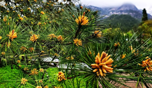 就在山巅杜鹃高调盛放之际,另一种令人意想不到的花,也在悄无声息地吐蕊。它竟是——黄山松之花。春夏之交,黄山松的花期总会如约而至,尽管没有娇嫩艳丽的花瓣,但每一朵小巧金黄的花蕊,都在茂密的针叶间努力地探出头,展示着黄山松千百年的顽强生命力。