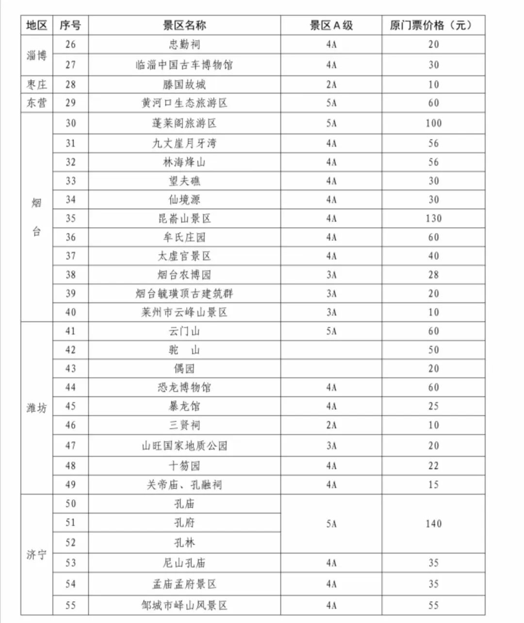 山东省5A级景区中的泰安泰山、济南天下第一泉风景区、青岛崂山风景名胜区、烟台蓬莱阁景区、济宁曲阜明故城(三孔)旅游区、潍坊青州云门山、东营黄河口生态旅游区等在门票优惠之列。