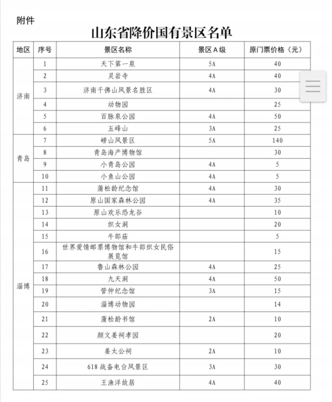 山东下调全省81家国有景区(5A级景区9个,4A级景区35个,3A级景区16个)门票价格,持续到2020年年底。其中,对9家5A级景区在原政府定价的门票价格基础上,全部执行不低于5折的票价优惠(除法定节假日外),具体价格由各市、各景区自行确定;对其余72家国有景区,在原政府定价的门票价格基础上,工作日执行2折票价,周末及法定节假日执行5折票价。
