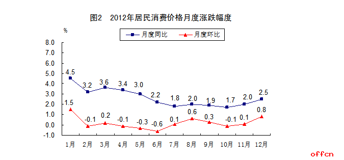全年居民消费价格比上年上涨2.6%,其中食品价格上涨4.8%。固定资产投资价格上涨1.1%。工业生产者出厂价格下降1.7%。工业生产者购进价格下降1.8%。农产品生产者价格上涨2.7%。