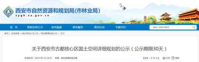 日前,西安市自然资源和规划局官网发布《关于西安市古都核心区国土空间详细规划的公示》,公示期为2024年9月14日至2024年10月13日。全文如下: