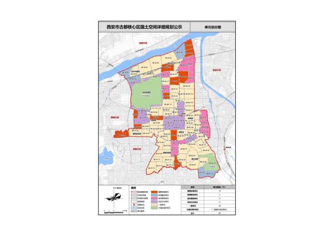 西安市古都核心区位于渭河以南,东与浐灞国际港接壤,西与西咸新区、高新片区相接,南与长安区为邻,包含碑林区、新城区、莲湖区、未央区(部分)、雁塔区(部分)、曲江新区、经开区(渭河以南部分)。规划编制范围总面积约为303平方公里,共涉及96个单元,其中重要发展单元12个、新增建设单元5个、城市更新单元11个、历史文化单元11个、一般单元56个、大遗址保护单元1个。