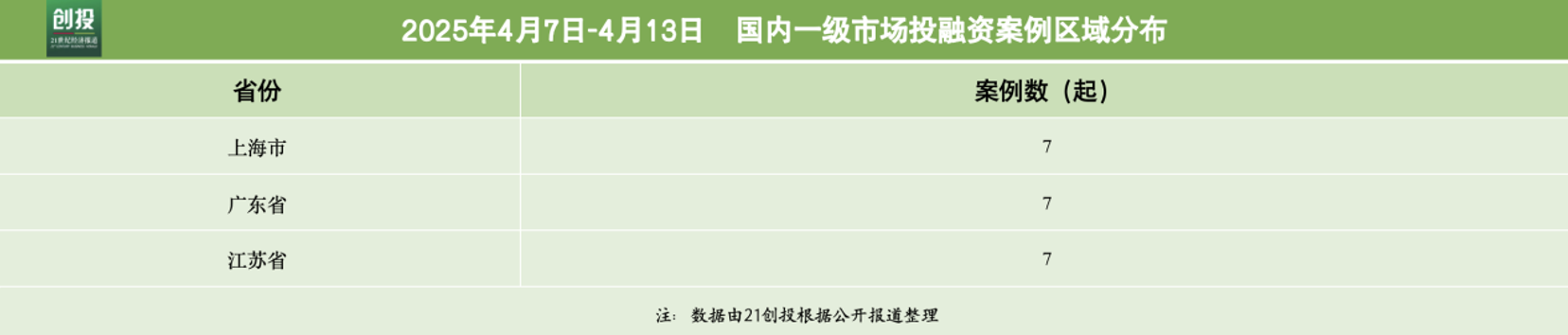 从披露获投企业的地域分布来看,本周的融资地区主要集中在上海市、广东省和江苏省,分别都完成7笔融资。