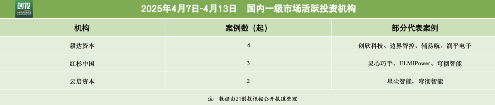 从机构投资活跃度来看,本周多家投资机构投资热情较高,且多聚焦科技与制造业。其中毅达资本披露4笔投资;红杉中国披露3笔投资;云启资本披露2笔投资,投资方向均为机器人赛道企业。